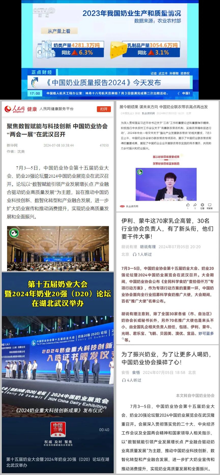 2024年7月3—5日,中国奶业协会第十五届奶业大会 奶业20强(D20)论坛暨2024中国奶业展览会在湖北武汉成功举办。本届“两会一展”规模大、层次高、影响力强,备受行业内外关注。层级规格创新高,副部级领导6位,工程院院士6位,厅局级领导66位,处级领导38位,奶业及相关企业负责人超过400位;展会规模创新高,行业观众6万多人,展览面积9.9万平方米,参展企业538家,专题论坛17个,专题报告101个。主题鲜明内容精彩,与会领导嘉宾一致认为,“两会一展”主题特别突出,内容十分丰富,形式异常精彩,展示成就、剖析问题、研讨战略、发布意见,对深入贯彻落实相关指示精神,对扎实推进奶业高质量发展意义重大。同时,“两会一展”的宣传报道高标准谋划、高频次预热、高质量发声,进行了全方位、立体式的融合传播展示,宣传推广效果创新高。据不完全统计,截至2024年7月8日16点,新华社客户端直播总播放量约407万次,全媒体总发稿量5000余篇(条),全网总传播量1亿+。中央电视台、新华社、人民日报、新华网、人民网等主流媒体,以及乳业资讯网、乳业时报、荷斯坦、奶牛微看、乳业财经、食悟、胡说有理等行业媒体,总共近百家媒体记者到会。新华社客户端对大会进行全程直播,央视2台正点财经栏目第一时间专题报道会上最新消息,众多媒体竞相报道并多角度、全方位、深层次宣传推广“两会一展”,助推会展传播力广、深入人心。更多稿件及视频发表还在密集进行中。