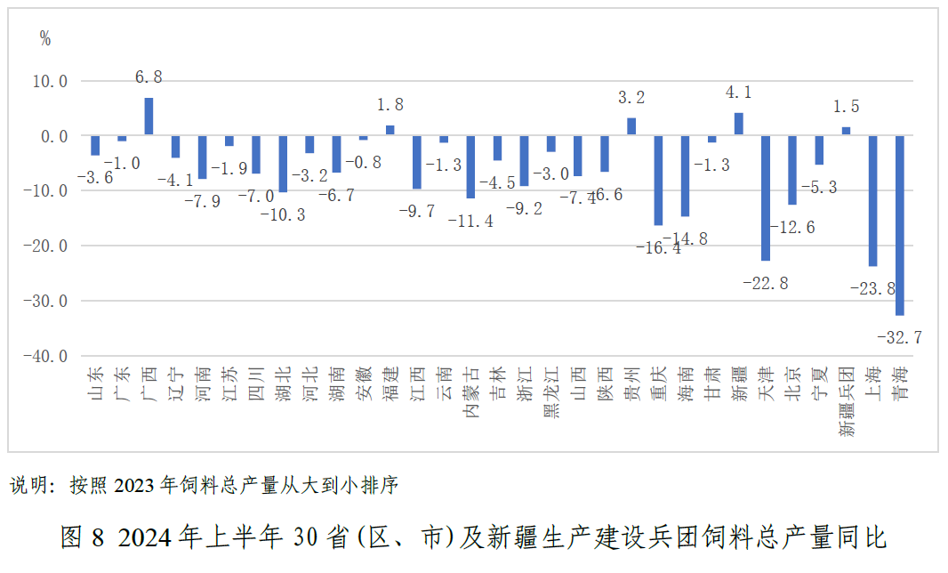 从不同省份看,上半年,广西、新疆、贵州、福建等4个省份和新疆生产建设兵团饲料产量同比增长,平均增幅3.5%;山东、广东、辽宁等26个省(区、市)同比下降,平均降幅8.8%。