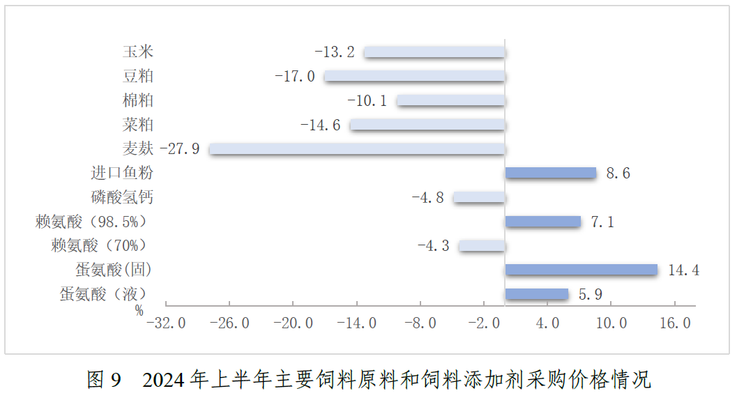 上半年,玉米、豆粕等主要饲料原料价格大幅回调。饲料企业玉米、豆粕采购均价分别为2524元/吨、3680元/吨,同比分别下降13.2%、17.0%。在粕类比价效应带动下,棉粕、菜粕价格分别为3746元/吨、2841元/吨,同比分别下降10.1%、14.6%。受去年秘鲁捕捞暂停影响,进口鱼粉价格延续高位,上半年采购均价14697元/吨,同比上涨8.6%。氨基酸市场以涨为主,维生素、矿物元素弱势运行。