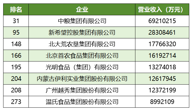排名第31位,营收69210215万元。2009年7月,中粮投资61亿港元收购蒙牛20%的股权,中粮成为蒙牛第一大股东。蒙牛以消费者为核心,智造高品质产品。围绕建立卓越的质量管理体系,蒙牛以系统化的视角,针对全员、全面、全过程、全产业链进行管理,以最严谨的标准指导产品在终端的合规性表现。此外,积极推动研发创新,研发资源网络覆盖全球60余家科研机构,打造400+品项的全方位、多元化产品矩阵。全面提升数字化能力,实现数字化精准投放,提升媒介效率;全域消费者运营,精益营销;实行一包一码,实现大数据端到端打通,从而实现更精准消费者沟通。排名95位,营收28308461万元。随改革开放大潮奋斗至今,新希望已发展为中国最大的肉、蛋、奶综合供应商之一,拥有中国最大的饲料加工产能和禽肉加工产能,在此基础上,新希望围绕主业积极延伸,形成了育种、养殖、猪鸡鸭牛肉加工、乳品加工、冷链物流、优质调味品、宠物食品、生态修复、金融服务等民生产业协同发展架构。新希望乳业是新希望集团的乳业板块,新希望乳业通过自有牧场,形成了“公司+牛场+农户”的经营模式,解决了“分散养殖,集中收购”这种传统模式所引发的乳企与分散奶农之间的松散关系,强化了奶产品在收集过程中的控制与监管力度。通过对奶牛育种、饲养、牧场、产品加工、冷链储运等优势资源,实现了从牧场到餐桌全程乳品质量监管及可追溯模式的质量反向追踪,实现乳业从单纯的数量扩张向整体结构优化转变,全面提高产业素质和核心竞争力。
