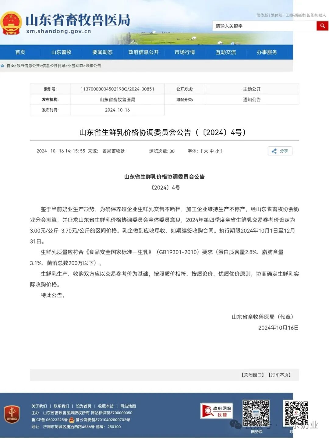 鉴于当前奶业生产形势,为确保养殖企业生鲜乳交售不断档,加工企业维持生产不停产,经山东省畜牧协会奶业分会测算,并征求山东省生鲜乳价格协调委员会全体委员意见,2024年第四季度全省生鲜乳交易参考价设定为3.00元/公斤-3.70元/公斤的区间价格。乳企做到应收尽收、如期续签收购合同。执行期限2024年10月1日至12月31日。生鲜乳质量应符合《食品安全国家标准—生乳》(GB19301-2010)要求(蛋白质含量2.8%、脂肪含量3.1%、菌落总数200万以下)。生鲜乳生产、收购双方应以交易参考价为基础,按照质价相符、按质论价、优质优价原则,协商确定生鲜乳实际收购价格。山东省畜牧兽医局(代章)