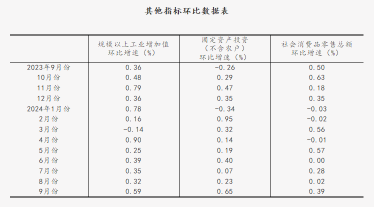 九、居民收入继续增长,农村居民收入增长快于城镇居民前三季度,全国居民人均可支配收入30941元,同比名义增长5.2%,扣除价格因素实际增长4.9%。按常住地分,城镇居民人均可支配收入41183元,同比名义增长4.5%,实际增长4.2%;农村居民人均可支配收入16740元,同比名义增长6.6%,实际增长6.3%。从收入来源看,全国居民人均工资性收入、经营净收入、财产净收入、转移净收入分别名义增长5.7%、6.4%、1.2%、4.9%。全国居民人均可支配收入中位数25978元,同比名义增长5.9%。总的来看,前三季度经济运行总体平稳、稳中有进,政策效应不断显现,主要经济指标近期出现积极变化。同时也要看到,外部环境更趋复杂严峻,经济回升向好基础仍需巩固。下阶段,要坚持以习近平新时代中国特色社会主义思想为指导,全面贯彻落实党的二十大和二十届二中、三中全会精神,认真落实党中央、国务院决策部署,坚持稳中求进工作总基调,完整、准确、全面贯彻新发展理念,加快构建新发展格局,强化存量政策和增量政策协同发力,推进各项政策加快落地见效,巩固和增强经济回升向好势头,努力完成全年经济社会发展目标任务。(1)国内生产总值及其分类项目增长速度按不变价计算,规模以上工业增加值及其分类项目增长速度按可比价计算,均为实际增长速度;其他指标除特殊说明外,按现价计算,为名义增长速度。 (2)根据季节调整模型自动修正结果,对近一年来各期国内生产总值、规模以上工业增加值、固定资产投资(不含农户)、社会消费品零售总额环比增速进行修订。修订结果及2024年三季度GDP环比数据、2024年9月份其他指标环比数据如下: 2023年各季度及2024年一季度、二季度、三季度GDP环比增速分别为1.8%、0.7%、1.5%、1.3%、1.5%、0.5%和0.9%。