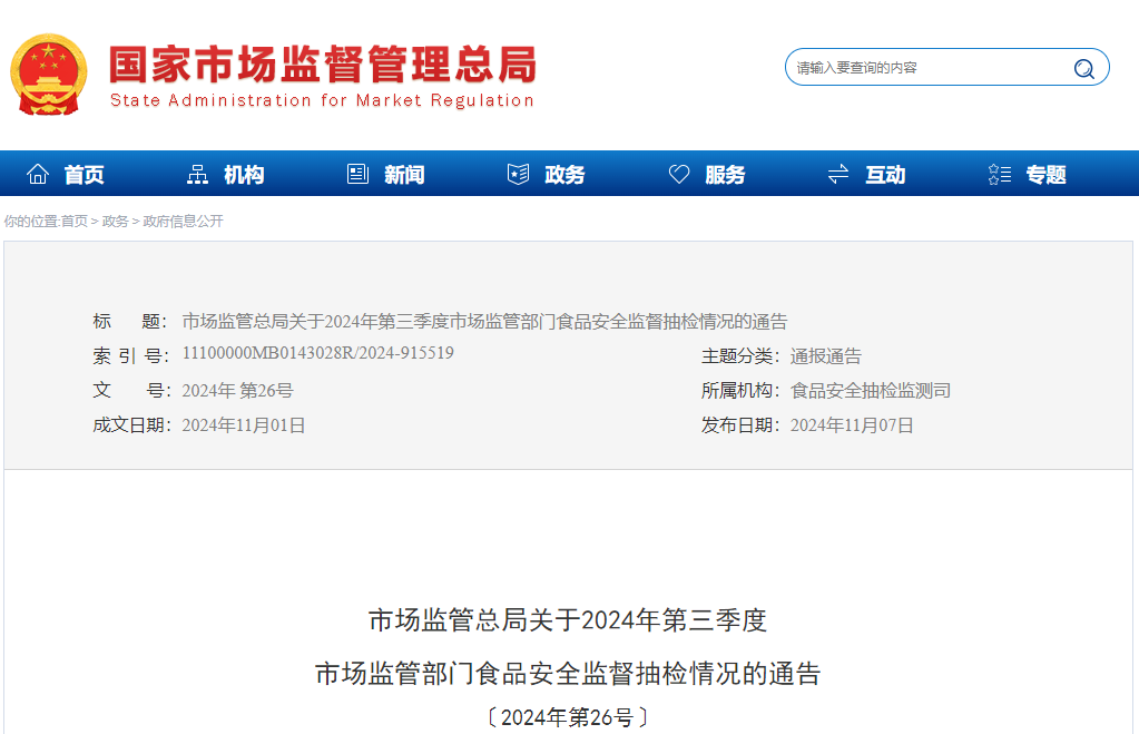 2024年第三季度,全国市场监管部门坚持以问题为导向,完成食品安全监督抽检2087424批次,依据有关食品安全国家标准等进行检验,发现不合格样品61572批次,监督抽检不合格率为2.95%,较2023年同期上升0.35个百分点。从抽样食品品种来看,消费量大的粮食加工品,食用油、油脂及其制品,肉制品,蛋制品,乳制品等5大类食品,监督抽检不合格率分别为0.67%、0.96%、0.87%、0.15%、0.13%,均低于总体抽检不合格率。与上年同期相比,蔬菜制品、炒货食品及坚果制品等13大类食品抽检不合格率有所降低,但水产制品、特殊膳食食品等20大类食品抽检不合格率有所上升。各类食品监督抽检结果见附件。从检出的不合格项目类别看,一些不合格项目占抽检不合格样品总量为:农药残留超标39.94%,微生物污染16.32%,超范围超限量使用食品添加剂14.99%,有机物污染问题11.29%,兽药残留超标6.76%,重金属污染5.55%,质量指标不达标4.15%。针对监督抽检发现的不合格样品,市场监管部门已向社会公布监督抽检结果,并督促有关生产经营企业及时下架、召回抽检不合格批次产品,严格控制食品安全风险,按有关规定进行核查处置。附件:2024年第三季度各类食品监督抽检结果汇总表(点击下方 “阅读原文” , 下载通告附件)市场监管总局