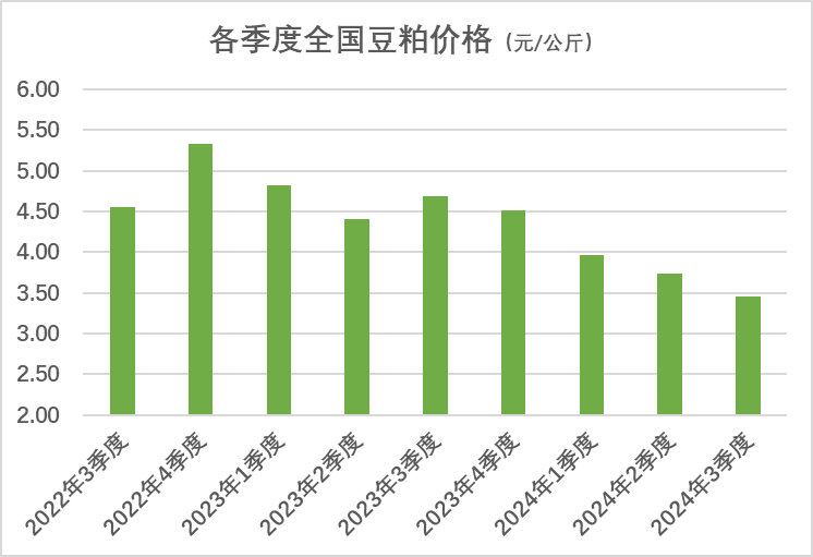 第三季度豆粕平均价格为3.46元/公斤,其中,7月份全国豆粕平均价格为3.59元/公斤,8月份 3.42元/公斤,9月份3.40元/公斤。7—9月份豆粕价格比2024年第二季度下降7.4%,和去年同期比下降26.3%。